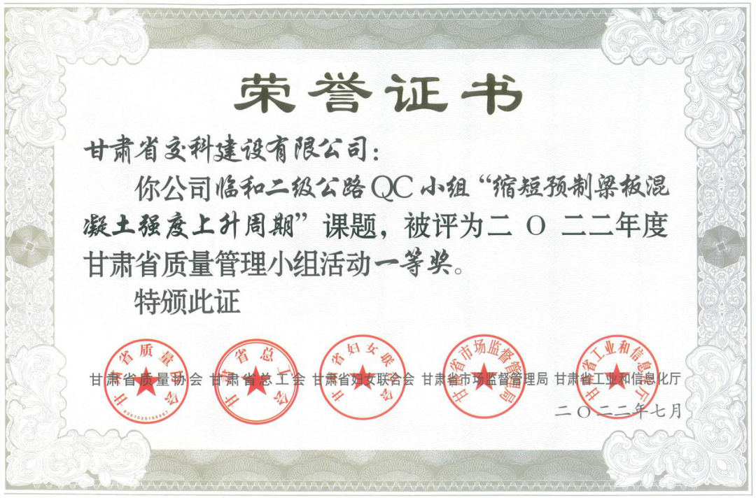 截至目前,交科公司连续三年荣获“甘肃省质量管理小组活动优秀企业”荣誉称号,共拥有省级QC成果特等奖2项、一等奖18项、二等奖3项。