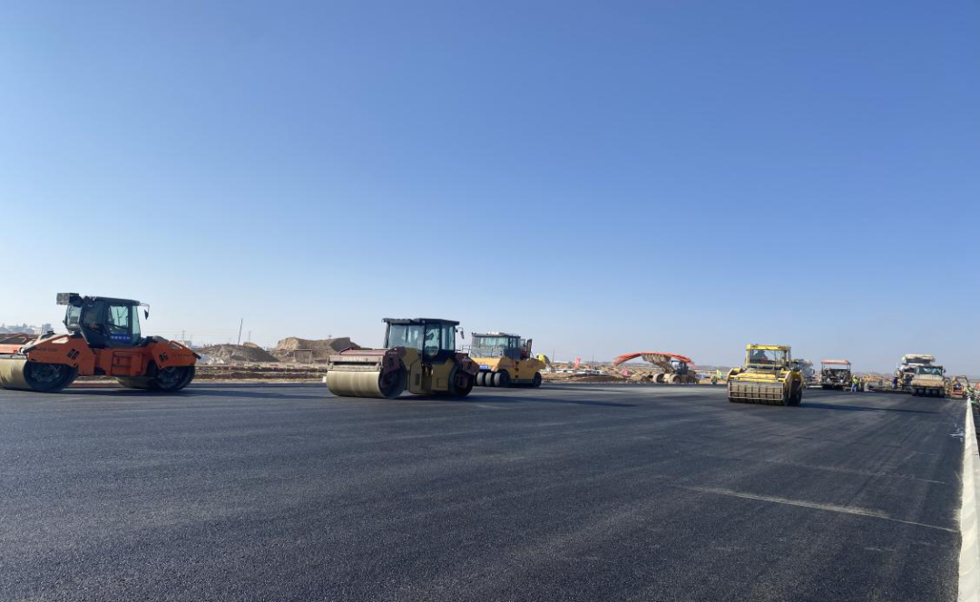 沥青路面铺设现场,油料运输机、摊铺机、压路机等各种机械隆隆作响,高温沥青油料从运料车上倾泻而下,工人们手拿铁铲等工具紧张而有序地进行路面铺设,刚刚摊铺下去的沥青冒着滚滚热气......目之所及,处处是大干快上和如火如荼的火热气氛。