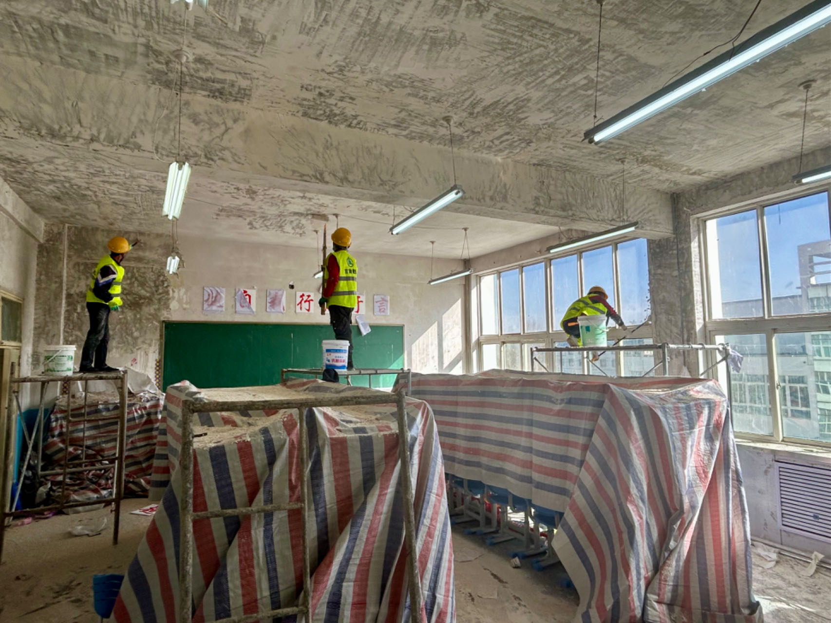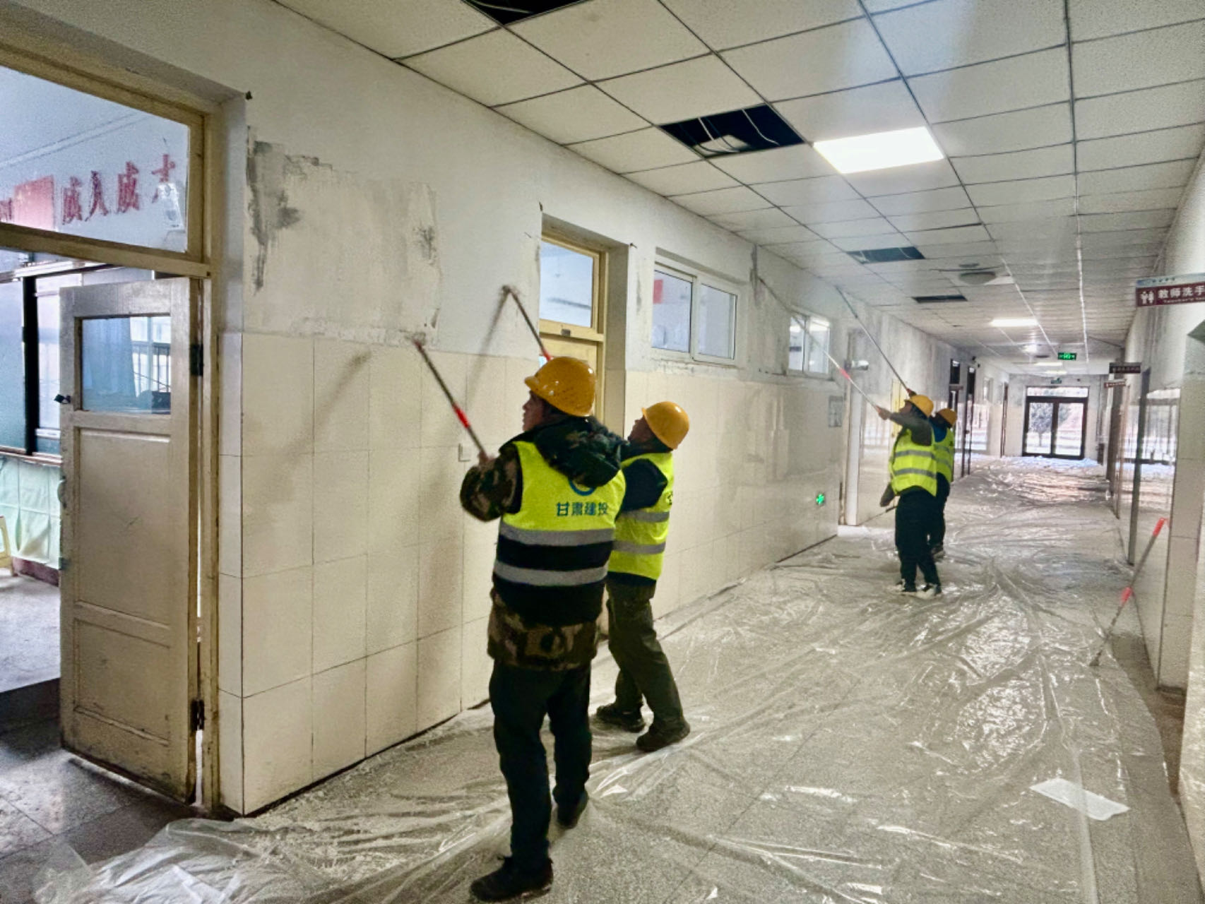 在各楼层维修现场,安全标识标牌张贴醒目、成品临时保护到位,60余名工人分工明确、责任到岗,铲墙皮、刮腻子、清废料、做防护,一派繁忙景象。“接到任务后,我们对6层教学楼内部墙面裂缝等问题进行了全面排查,统筹制定施工计划方案,第一时间召开工作会议,对维修工作进行了安排部署!”现场负责人员缑世君告诉笔者,进入现场后,全体作业人员立刻投入作业,主动联系施工队伍、装修材料、后勤保障物资进场,各小组明确施工任务和工作要求,按计划组织施工,做好施工任务日计划、日盘点,抓好任务落实。目前,已同步开展近二十间教室和二、三层教学楼墙面维修,外立面保温层维修将按计划陆续推进。