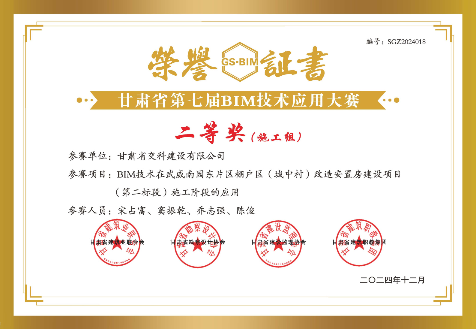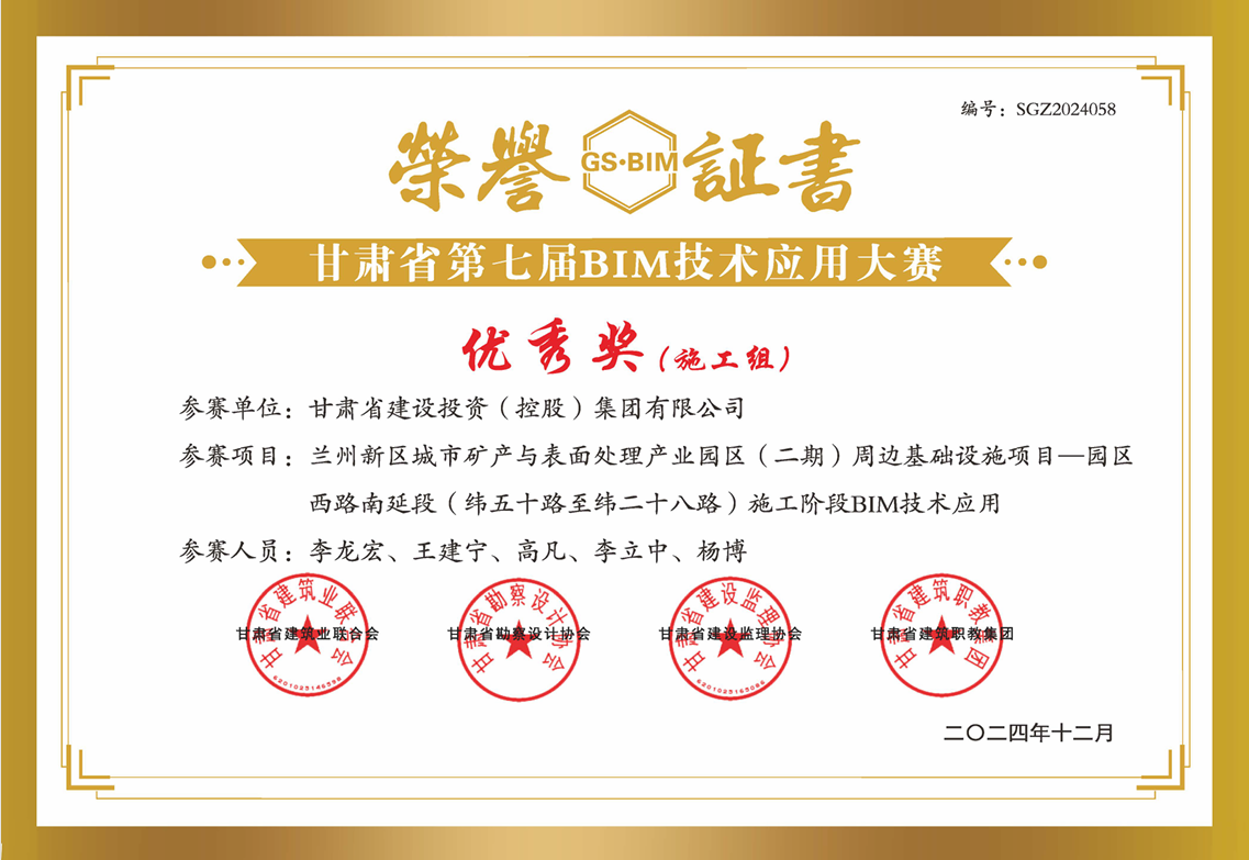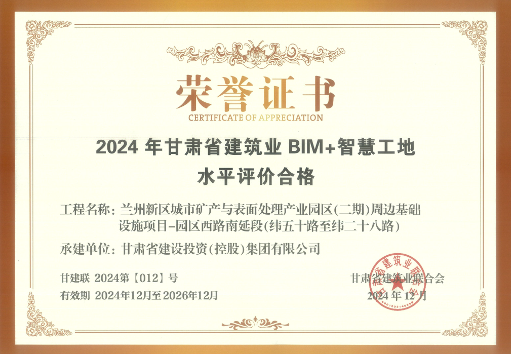 近日,甘肃省第七届BIM技术应用大赛结果揭晓,甘肃省交科建设有限公司选送的《BIM技术在武威南园东片区棚户区(城中村)改造安置房建设项目(第二标段)施工阶段的应用》《兰州新区矿产与表面处理产业园区(二期)周边基础设施项目—园区西路南延段(纬五十路至纬二十八路)施工阶段BIM技术应用》分获施工组二等奖、优秀奖,兰州新区矿产园区西路南延段项目荣获“2024年甘肃省建筑业BIM+智慧工地水平评价合格项目”。