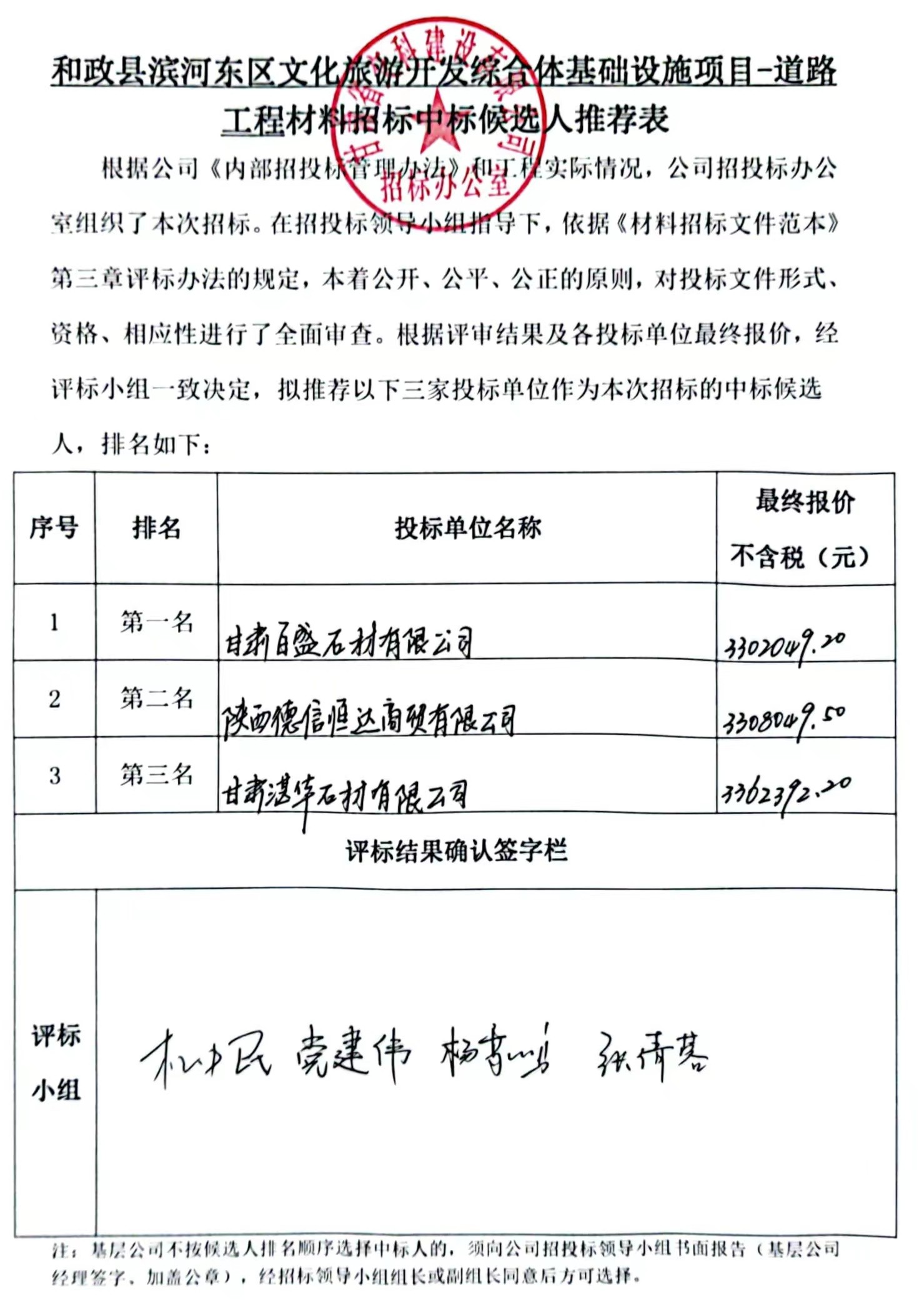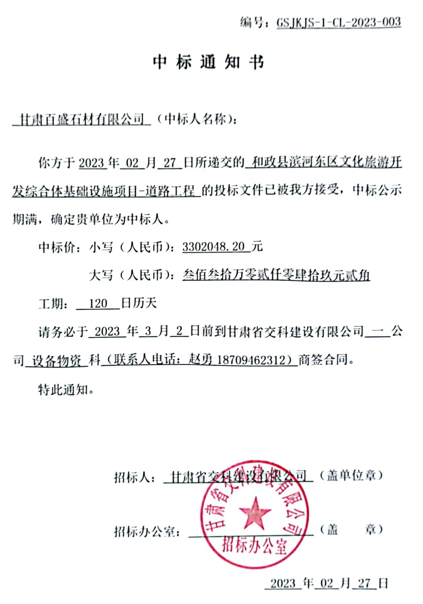 和政县滨河东区文化旅游开发综合体基础设施项目-道路工程中标候选人及中标通知书