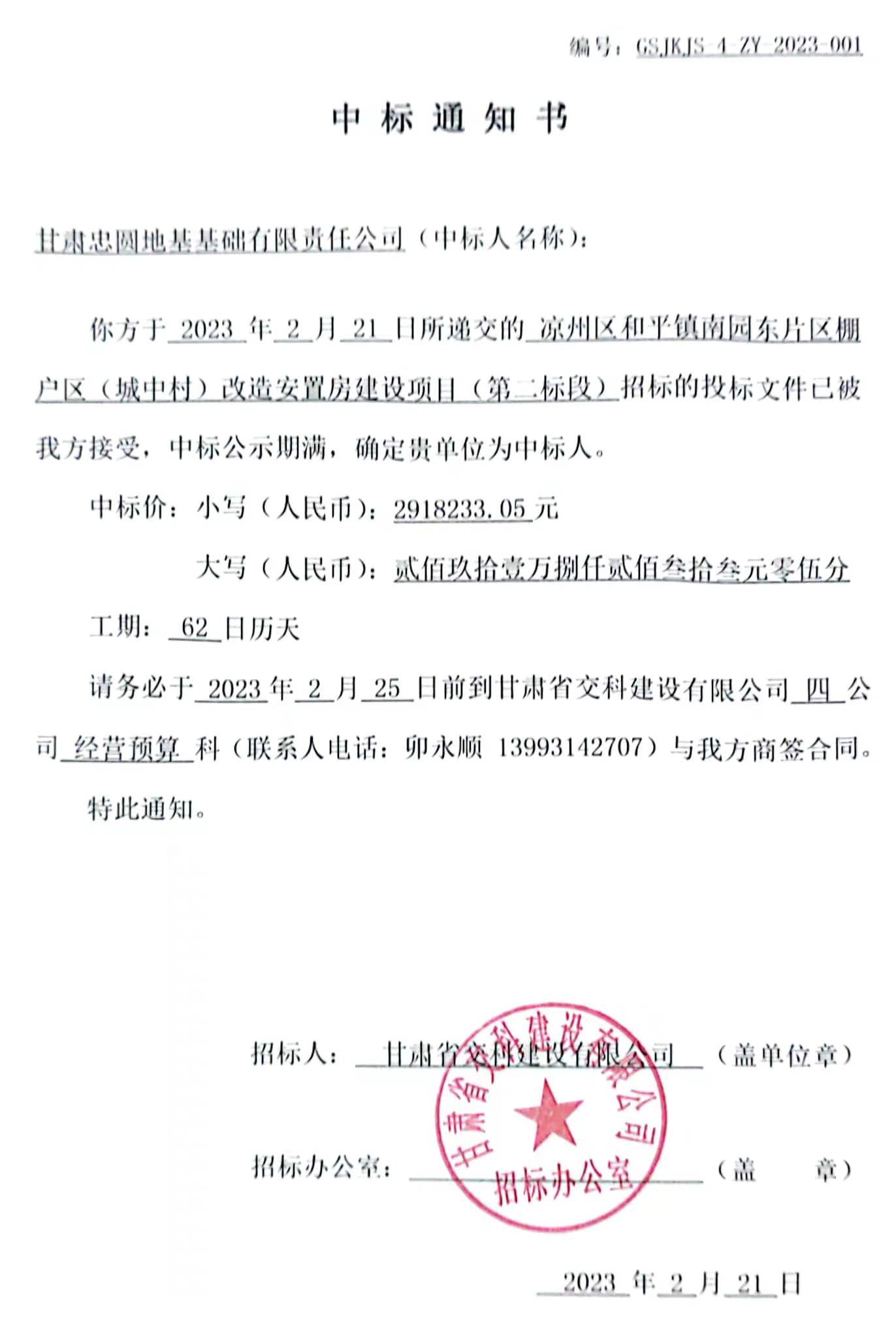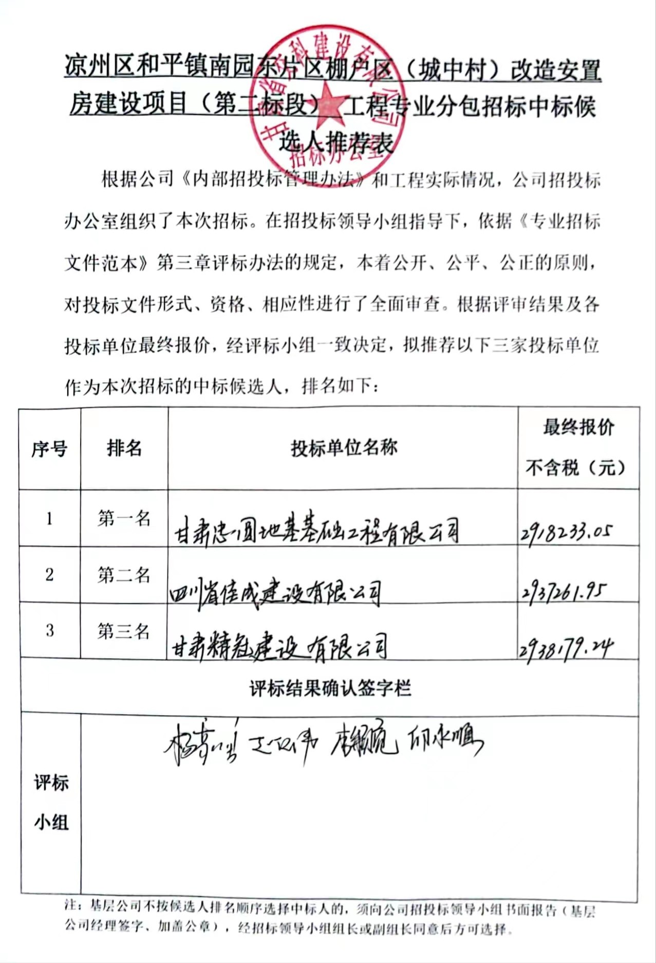 凉州区和平镇南园东片区棚户区(城中村)改造安置房建设项目(第二标段)中标候选人及中标通知书