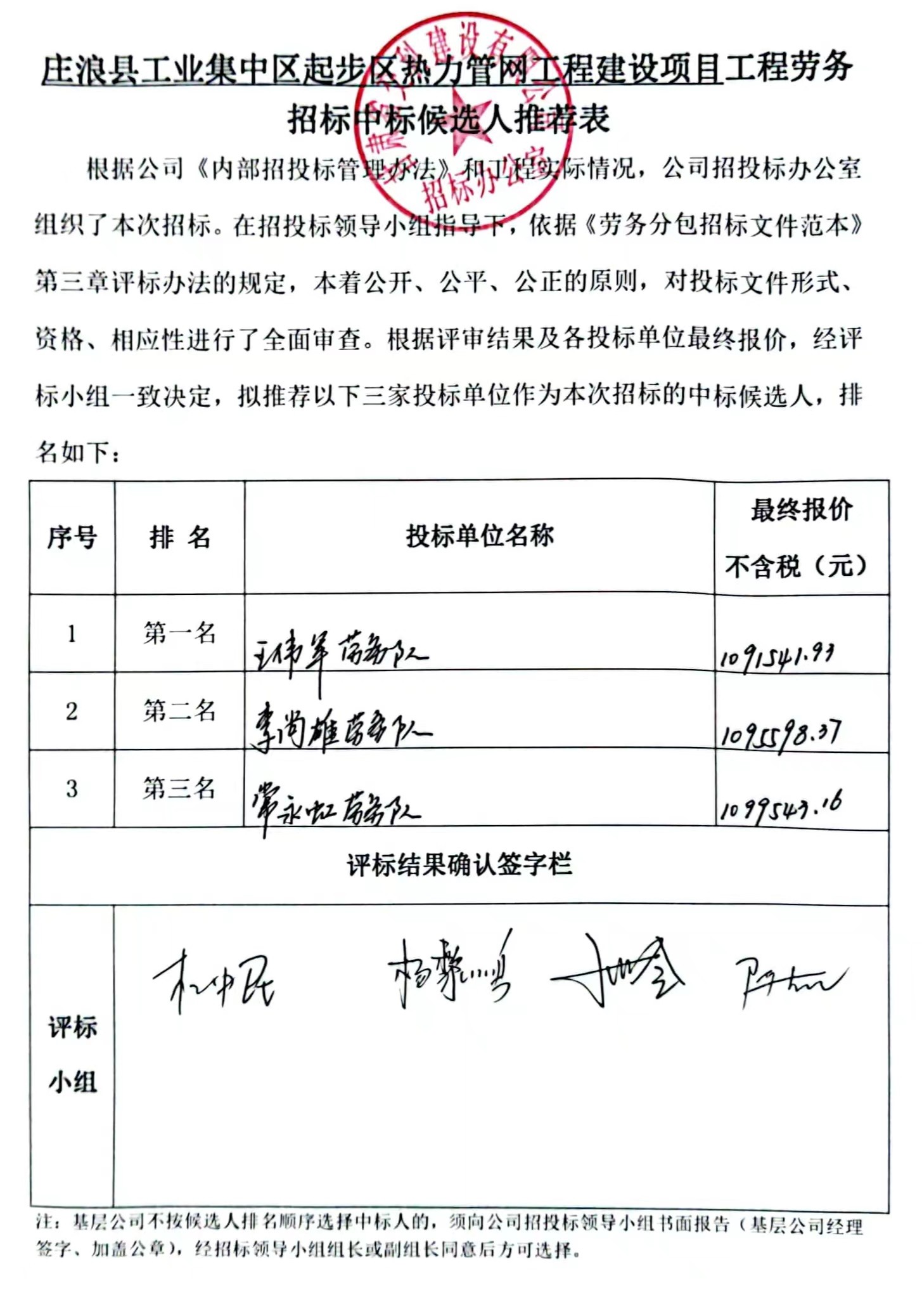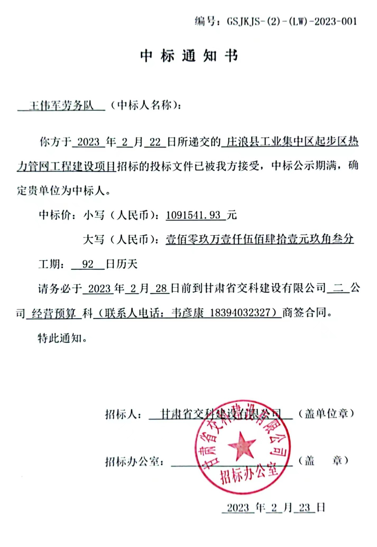 庄浪县工业集中区起步区热力管网工程建设项目中标候选人及中标通知书