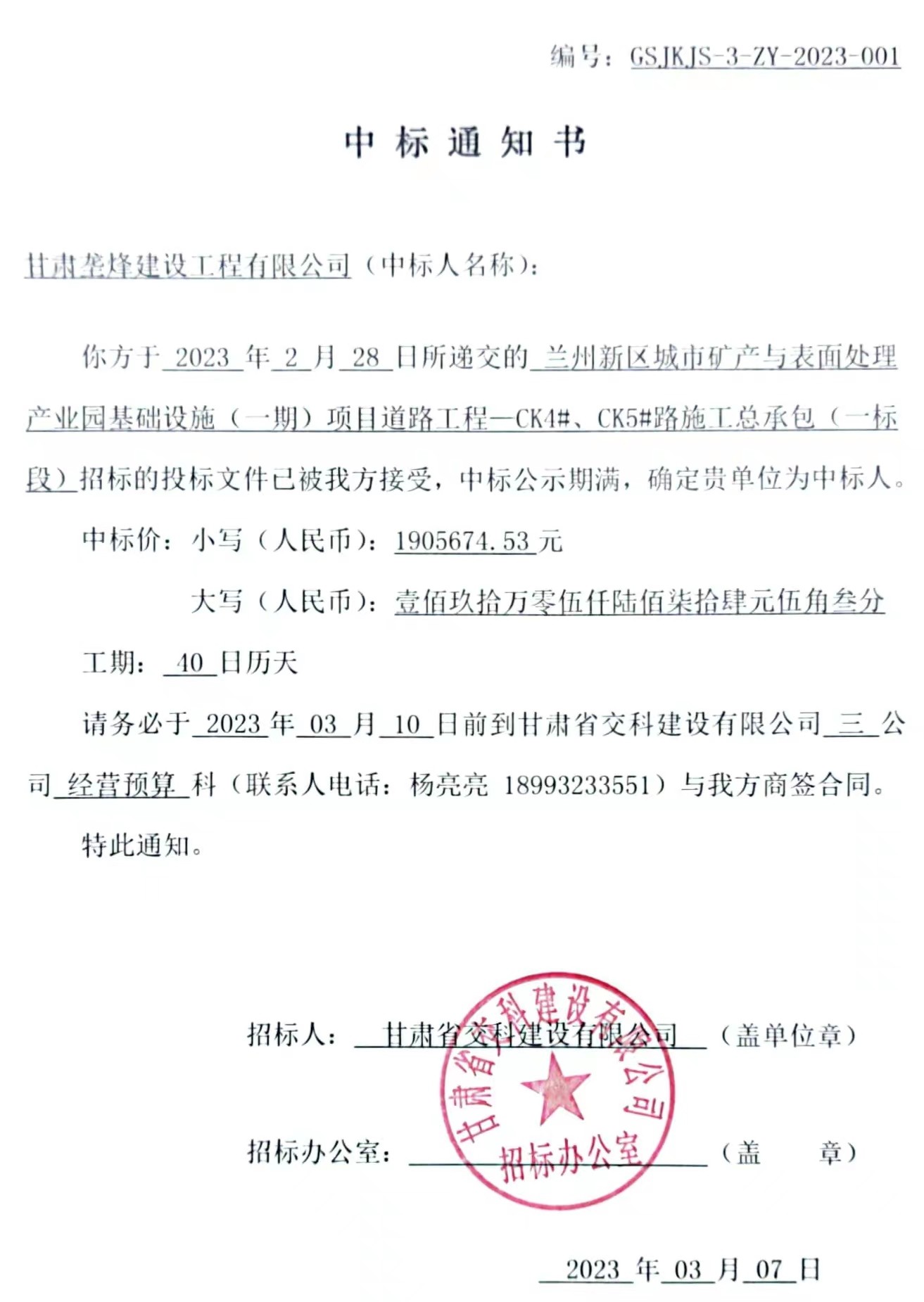 兰州新区城市矿产与表面处理产业园基础设施(一期)项目道路工程—CK4#、CK5#路施工总承包(一标段)中标候选人及中标通知书