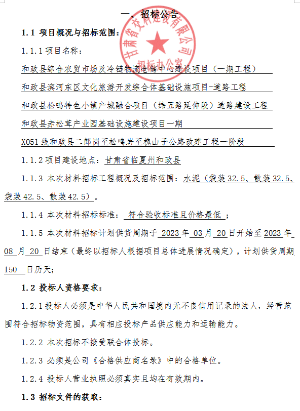 和政县综合农贸市场及冷链物流仓储中心建设项目(一期工程);和政县滨河东区文化旅游开发综合体基础设施项目-道路工程 ;和政县松鸣特色小镇产城融合项目(纬五路延伸段)道路建设工程;和政县赤松茸产业园基础设施建设项目一期;X051线和政县二郎岗至松鸣岩至槐山子公路改建工程一材料招标公告