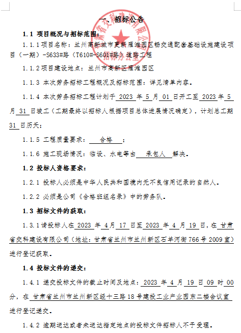 兰州高新城市更新雁滩园区畅交通配套基础设施建设项目(一期)-S633#路(T610#-S601#路)道路工程雨水、污水施工劳务分包招标