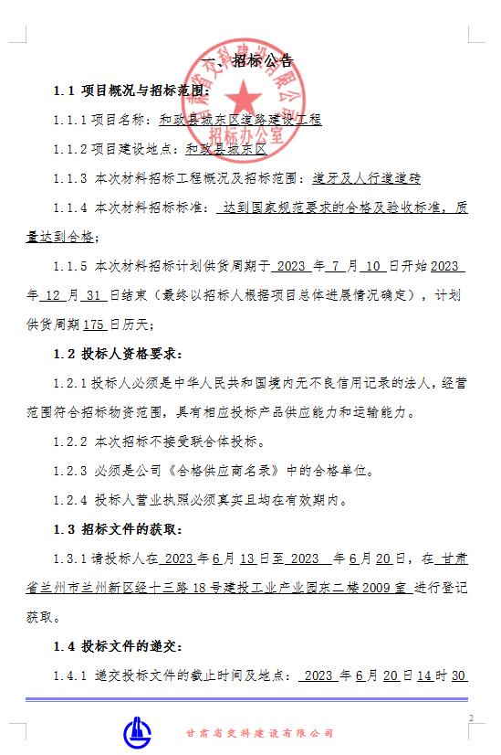 和政县城东区道路建设工程-路缘石招标公告