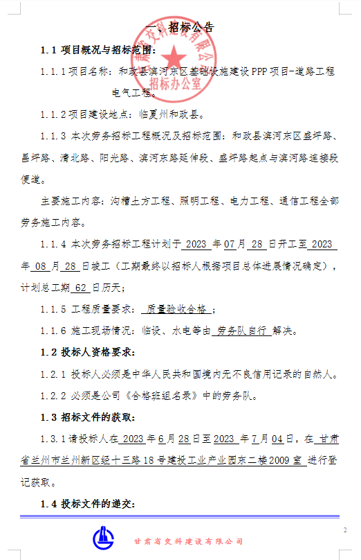 和政县滨河东区基础设施建设PPP项目-道路工程电气工程-招标公告