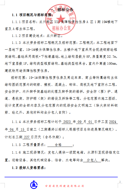 兰州新区XXX保障租赁性住房A 区1期19#楼地下室及A塔主体工程劳务招标公告