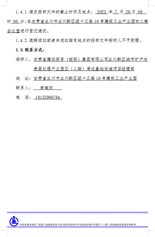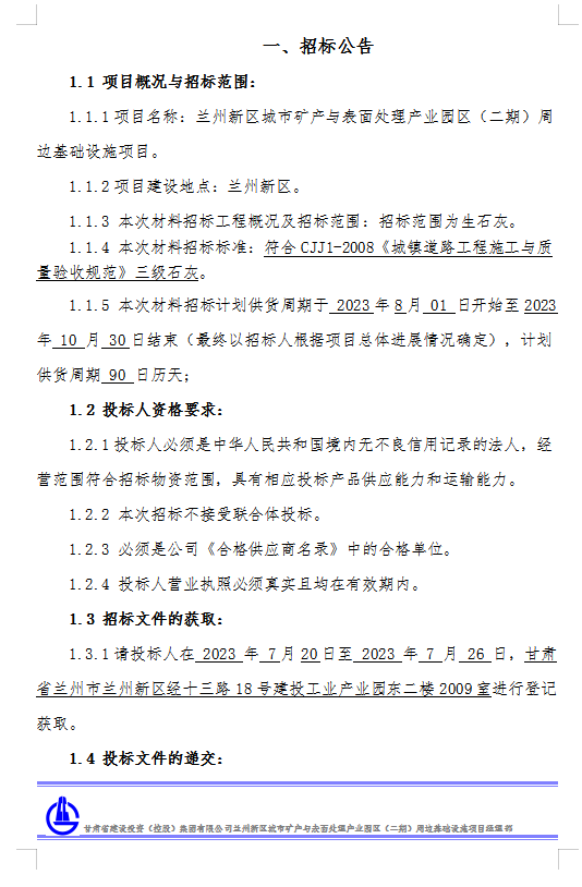 兰州新区城市矿产与表面处理产业园区(二期)周边基础设施项目生石灰招标公告