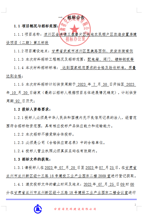 凉州区金羊镇三盘磨片区失地农民棚户区改造安置房建设项目(二期)第三标段材料招标公告