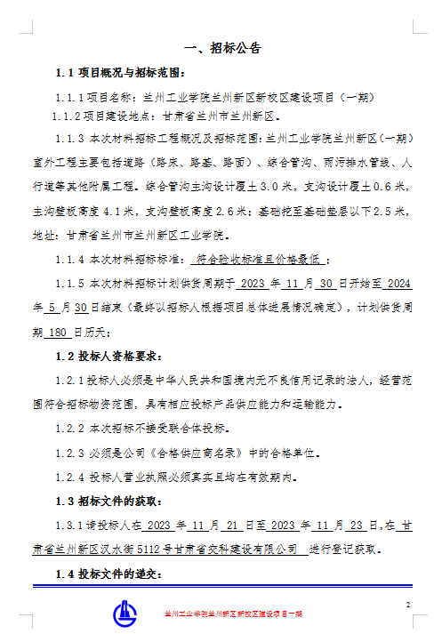 兰州工业学院兰州新区新校区建设项目(一期)--材料招标公告