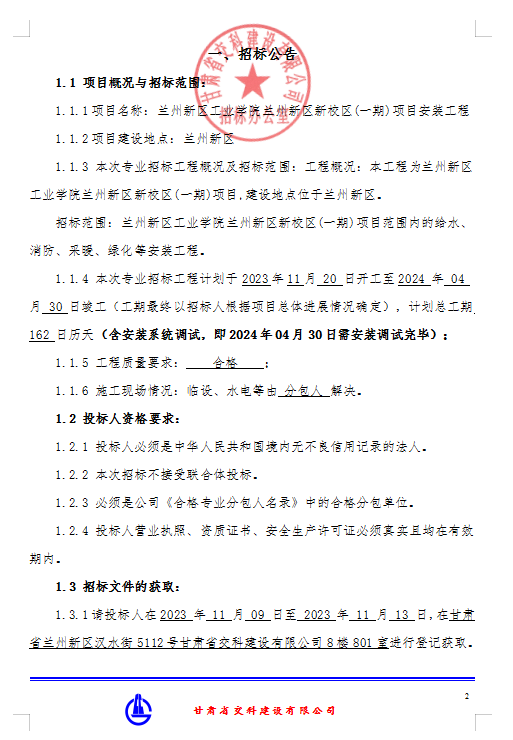 兰州新区工业学院兰州新区新校区 (一期)项目安装工程-专业分包招标公告