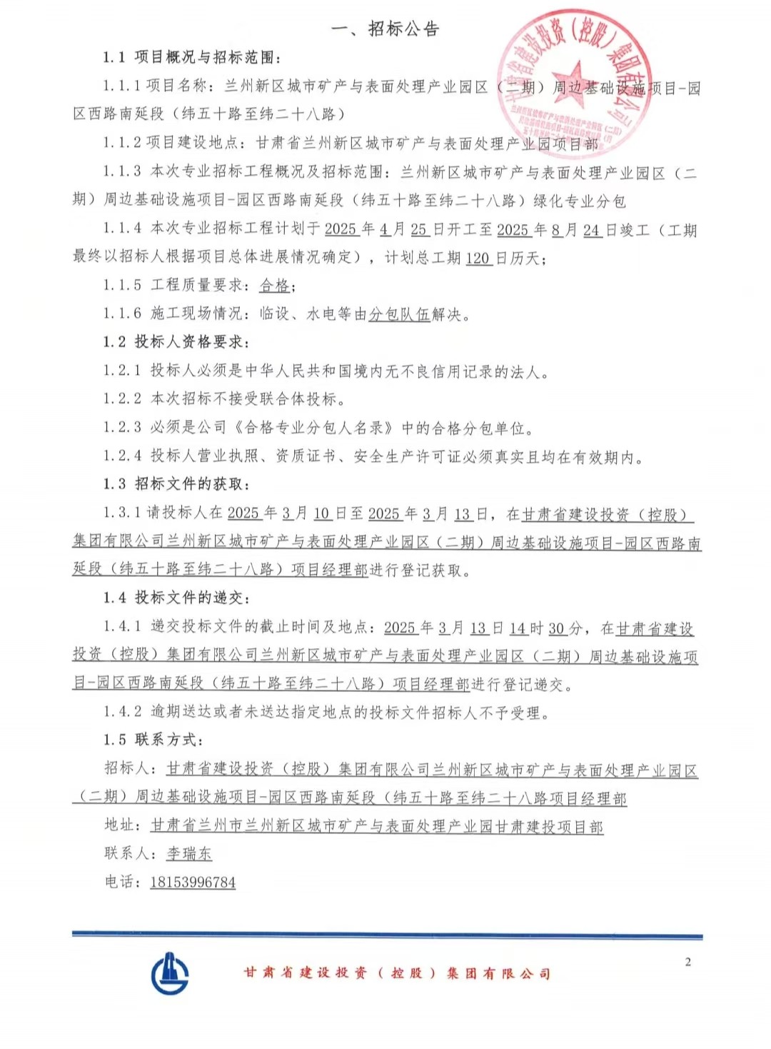 兰州新区城市矿产与表面处理产业园区(二期)周边基础设施项目-园区西路南延段(纬五十路至纬二十八路)绿化专业分包-招标公告