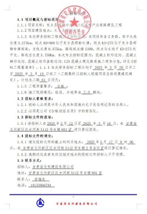 东乡县那勒寺镇沿川经济带产业道路建设工程劳务分包招标公告