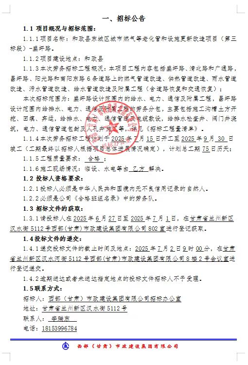 和政县东城区城市燃气等老化管和设施更新改造项目(第三标段)-盛坪路-劳务分包-招标公告