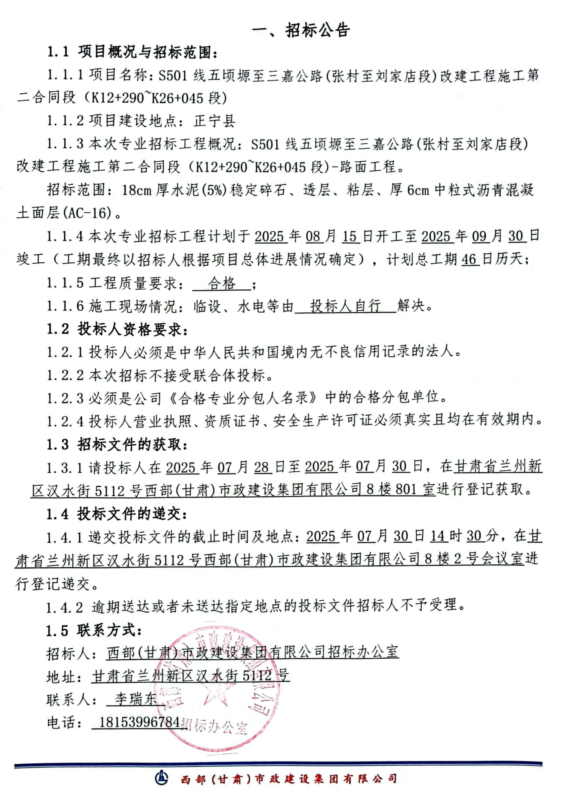 S501线五顷塬至三嘉公路(张村至刘家店段)改建工程施工第二合同段(K12+290-K26+045段)-专业分包-招标公告