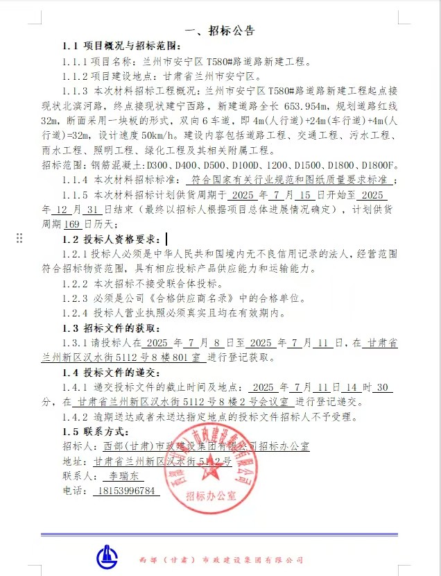 兰州安宁区T580#路道路新建工程—材料招标